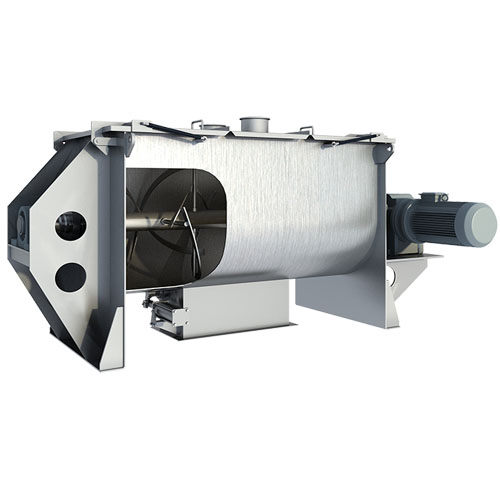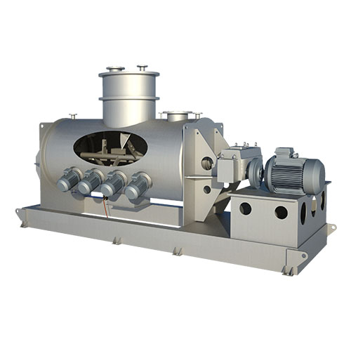 A multiple-motion mixer can be one of two types: a double shaft mixer with paddles or plow blades or a kneading mixer. A double shaft mixer typically has two horizontal impellers consisting of shafts mounted with paddles or plow blades; the paddles or blades on one shaft overlap those on the other shaft. In operation, the impellers counter-rotate, fluidizing and mixing the material. The mixer is used for powders and some moist materials. A kneading mixer (also called a double-arm kneading mixer) typically consists of either a horizontal or vertical cylindrical housing enclosing two impellers. The impellers sometimes can rotate around each other, creating planetary rotation, and can also overlap or intermesh. In operation, the impellers counter-rotate, fluidizing and kneading the mixture. The mixer is frequently used for mixing pastes, because its kneading action allows reactions to go from dry to paste phases when liquid is added. The kneading action also makes the mixer suitable for dry mixtures to produce solids or powders. When used for drying, the mixer uses a heated air stream, a heat jacket, or even an open flame to dry the materials and, typically, a small purge stream to remove moisture vapor.